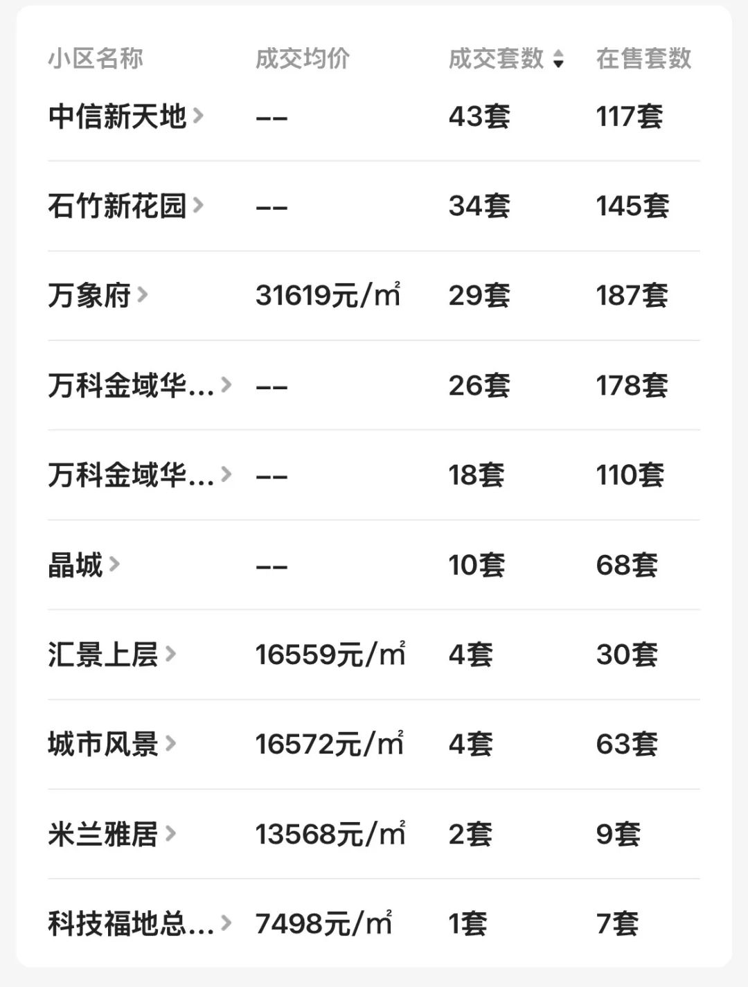 中信新六合近1年成交了43套,包罗东骏豪苑、光大景湖春晓、新中银金色华庭、金地格林小城,有一部门看空屋地产的业从,中信丛林湖139套…